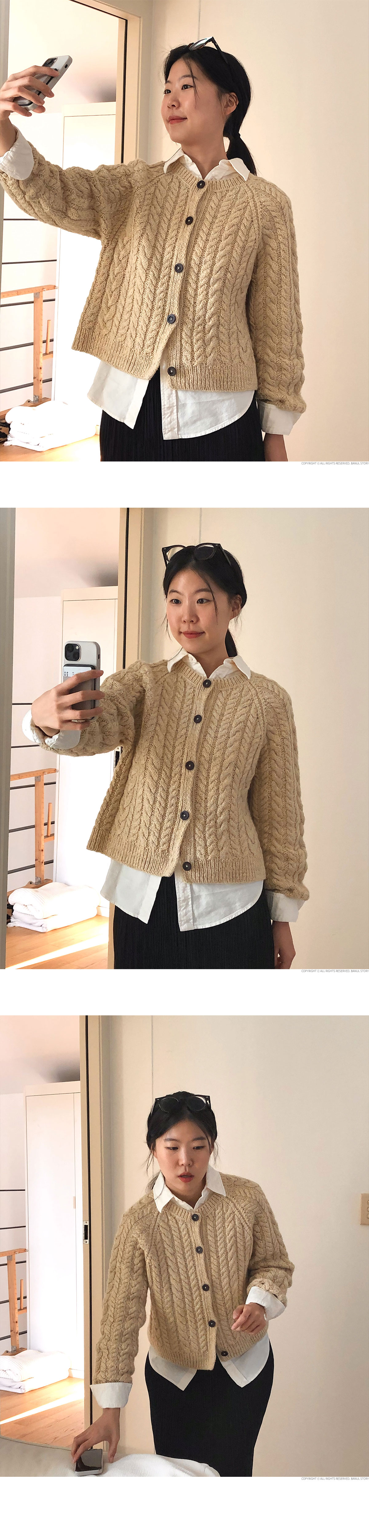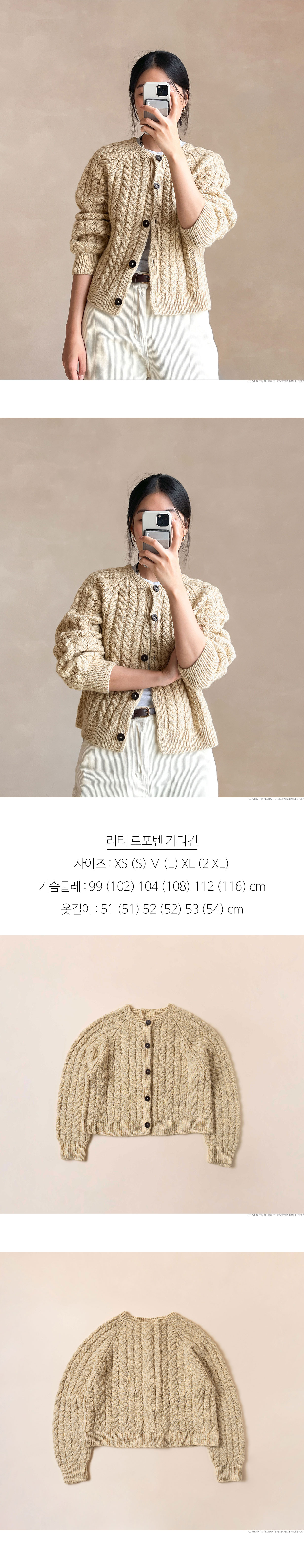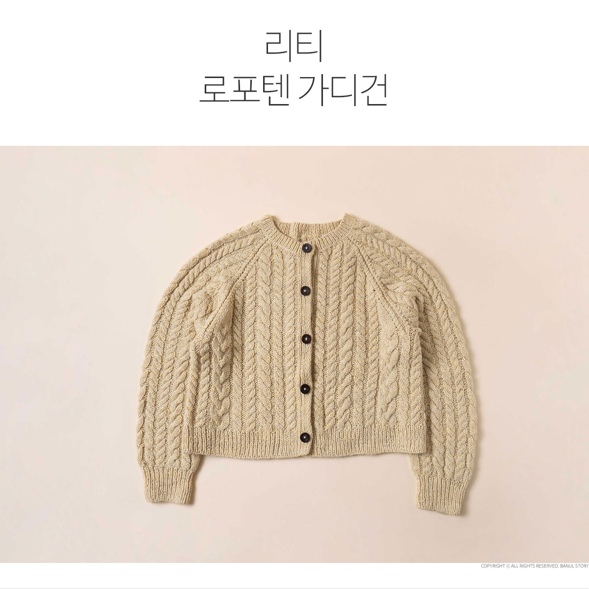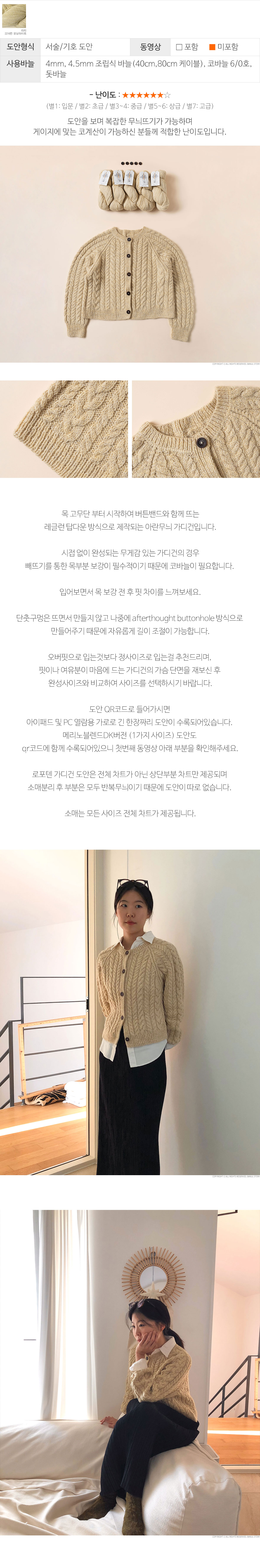 + 작품색상: 리티 2216번(모닝라이트) + 착용 사이즈: M + 제품구성(사이즈 XS 기준): 리티(색상선택) 5볼 + 볼드 나무 단추(20mm, 다크브라운) 5개 + 도안 + 사용바늘(별도구매): 4mm, 4.5mm 조립식 바늘 + 40cm, 80cm 케이블, 모사용 코바늘 6/0호, 돗바늘 + 게이지: 30코 24단(4.5mm바늘, 12.5cm×10cm, 4코교차+안2+4코교차+안2+6코교차+안2+4코교차+안2+4코교차 무늬) / 13코 8단(4.5mm바늘, 6cm×3.5cm(1무늬), 안2+9코 꽈배기+안2) + 사이즈: XS (S) M (L) XL (2XL) (※완성치수는 뜨개방법과 솜씨에 따라 사이즈의 오차가 생길 수 있습니다.) + 가슴둘레: 99 (102) 104 (108) 112 (116) cm + 옷길이: 51 (51) 52 (52) 53 (54) cm + 실사용량: 5 (5) 6 (6) 6 (6) 볼 / 약 485 (500) 520 (545) 570 (600) g + 뜨개방법: 끌어올리기 고무단, 겉뜨기, 안뜨기, 턴(져번숏로우), M1R, M1L, 꼬아뜨기, 걸러뜨기, 교차뜨기 (기초뜨는 방법은 홈페이지 내 동영상강좌 및 손뜨개기초강좌 참고) 목 고무단 부터 시작하여 버튼밴드와 함께 뜨는 레글런 탑다운 방식으로 제작되는 아란무늬 가디건입니다. 시접 없이 완성되는 무게감 있는 가디건의 경우 빼뜨기를 통한 목부분 보강이 필수적이기 때문에 코바늘이 필요합니다. 입어보면서 목 보강 전 후 핏 차이를 느껴보세요. 단춧구멍은 뜨면서 만들지 않고 나중에 afterthought buttonhole 방식으로 만들어주기 때문에 자유롭게 길이 조절이 가능합니다. 오버핏으로 입는것보다 정사이즈로 입는걸 추천드리며, 핏이나 여유분이 마음에 드는 가디건의 가슴 단면을 재보신 후 완성사이즈와 비교하여 사이즈를 선택하시기 바랍니다. 도안 QR코드로 들어가시면 아이패드 및 PC 열람용 가로로 긴 한장짜리 도안이 수록되어있습니다. 메리노블렌드DK버전 (1가지 사이즈) 도안도 qr코드에 함께 수록되어있으니 첫번째 동영상 아래 부분을 확인해주세요. 로포텐 가디건 도안은 전체 차트가 아닌 상단부분 차트만 제공되며 소매분리 후 부분은 모두 반복무늬이기 때문에 도안이 따로 없습니다. 소매는 모든 사이즈 전체 차트가 제공됩니다.