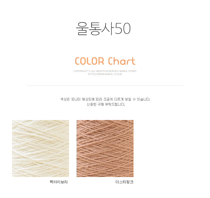 + 사용바늘: 대바늘 4mm + 혼용율: 울50%, 아크릴50% + 게이지: 21.5코 x 32단 (대바늘 4mm, 10cm x 10cm, 메리야스 편물) + 사진으로 보여지는 실의 느낌처럼 통통하게 벌키감이 느껴지는 실 입니다. + 모헤어 등과 합사하여 의류용이나, 코바늘도 용이하게 사용이 가능합니다. + 의류나 모자, 머플러등 활용도가 높고, 아주 부드러운 느낌의 실은 아니라 아란무늬, 코바늘등 무늬를 잘 살릴 수 있는 실입니다.