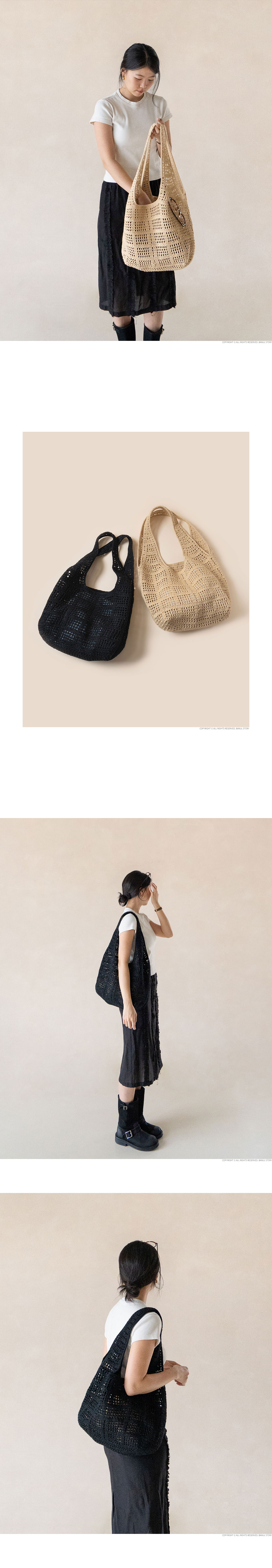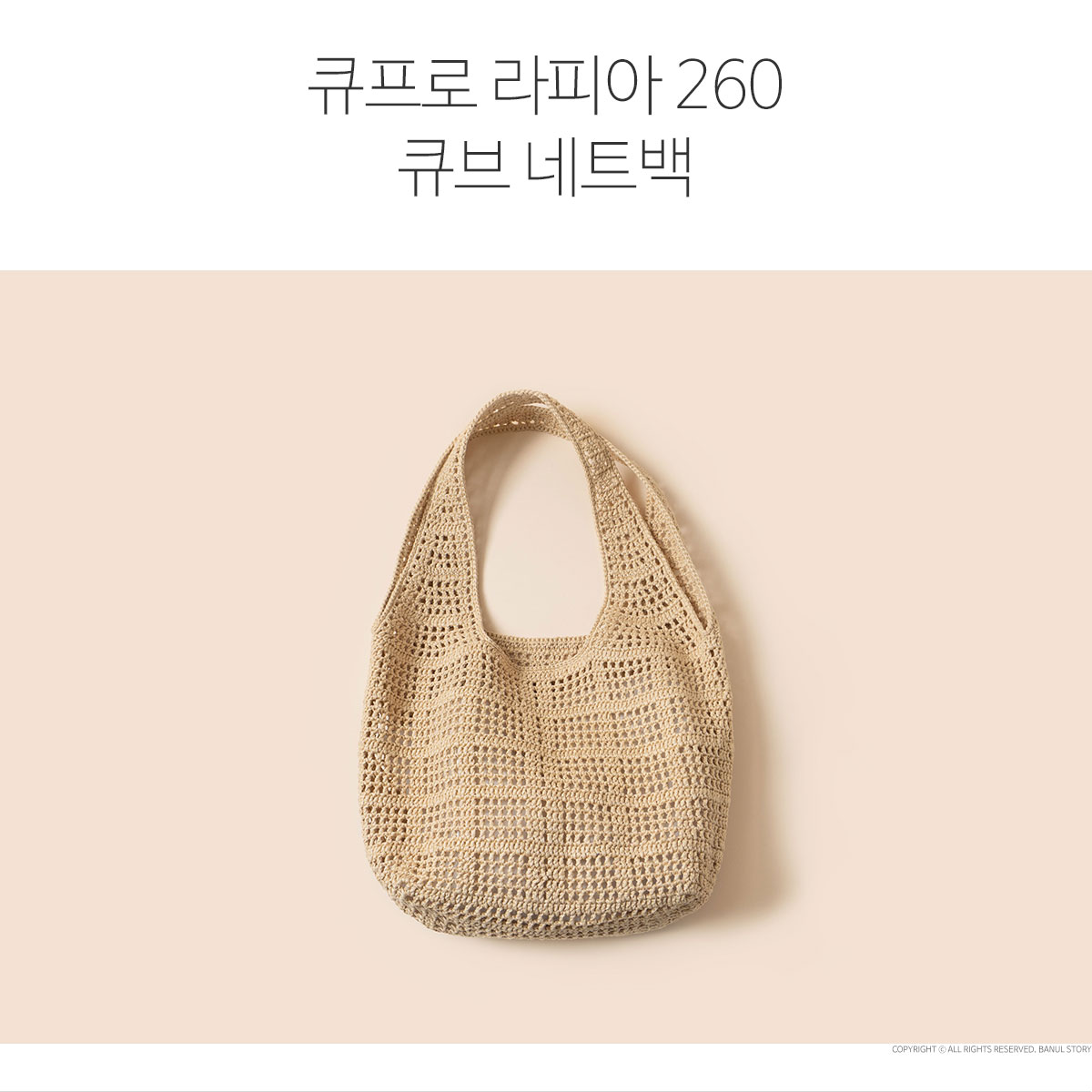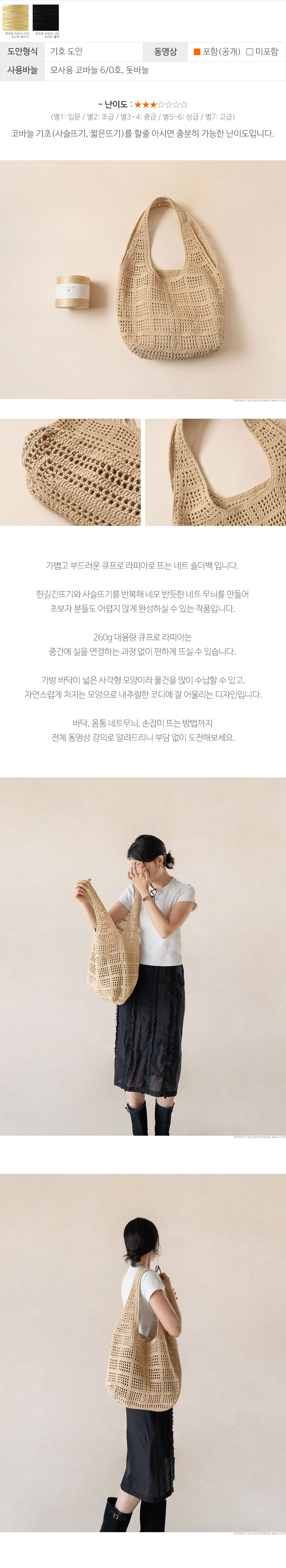 ![]() + 작품색상: 큐프로 라피아 260 601번(베이지), 큐프로 라피아 260 605번(블랙) + 패키지 구성: 큐프로 라피아 260(색상선택) 1볼 + 도안 + 사용바늘(별도구매): 모사용 코바늘6/0호, 단수표시링, 돗바늘 + 사이즈: 너비 41cm x 높이 35cm (손잡이 포함 높이- 60cm) (※완성치수는 뜨개방법과 솜씨에 따라 사이즈의 오차가 생길 수 있습니다.) + 게이지: 21코 × 9.5단(6/0호 코바늘, 10×10cm 몸판 무늬) + 뜨개방법: 사슬뜨기, 짧은뜨기, 한길긴뜨기, 빼뜨기 (기초 뜨는 방법은 바늘이야기 유튜브 참고) 가볍고 부드러운 큐프로 라피아로 뜨는 네트 숄더백 입니다. 한길긴뜨기와 사슬뜨기를 반복해 네모 반듯한 네트 무늬를 만들어 초보자 분들도 어렵지 않게 완성하실 수 있는 작품입니다. 260g 대용량 큐프로 라피아는 중간에 실을 연결하는 과정 없이 편하게 뜨실 수 있습니다. 가방 바닥이 넓은 사각형 모양이라 물건을 많이 수납할 수 있고, 자연스럽게 처지는 모양으로 내추럴한 코디에 잘 어울리는 디자인입니다. 바닥, 몸통 네트무늬, 손잡이 뜨는 방법까지 전체 동영상 강의로 알려드리니 부담 없이 도전해보세요.